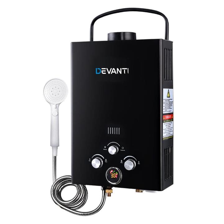 Planning on a road trip or camping adventure? And you do not want to miss out on your warm showers? Look no further than the Devanti Gas Water Heater to meet your outdoor showering needs. Easy to install, the water heater can heat up to 480L of water per hour at your preferred temperature setting conveniently shown on the LED display. No worries about getting accidentally scalded too as the heater has a built-in processor that sets the maximum water temperature at 50°C. Together with a host of other great safety features, the variable flow shower head is also designed to automatically ignite or turn off the burner by a simple on/off trigger. Lightweight and portable, the water heater comes with a handy handle and all the required mounting brackets for a hassle-free set-up. Enjoy the open country. And enjoy your warm showers too with the Devanti gas water heater.Note: For outdoor use only. LPG portable gas bottle required for use.FeaturesLightweight and portableLED digital displayFully adjustable temperature with maximum 50°CConstant water flow of up to 8L/minWinter and summer settingWater flow adjustmentDry burning protectionFlame out protectionIncline resistant protectionCost effective and environmentally friendlyVariable flow shower head with automatic on/off triggerMounting bracketsConvenient carry handleUses 2 x D Cell Batteries (Not included)Complies to Australian standardsGas Safety CertifiedSpecificationsBrand: DevantiTotal nominal gas consumption: 28MJ/hGas pressure: 2.8kPAMinimum water pressure: 0.3MPaMaximum water pressure: 1.0MPaMaximum water temperature: 50°CGas: LPGFlow rate: 480L/HBattery: 2 x D Cell (not included)Colour: BlackPackage Content1 x Devanti Gas Water Heater 1 x White Plastic Shower Head 1 x Chrome Shower Hose1 x Gas Hose 1 x Gas Regulator1 x Water Connector1 Set x Mounting Accessories 1 x User Manual