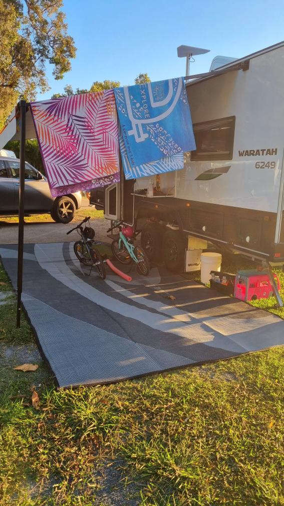 4m x 2.4m Recycled Poly MatUpgrade your camping experience with our spacious 4m x 2.4m recycled poly mat, perfectly designed for vans 12ft to 18ft (single axle) setups. Lightweight, durable, and eco-conscious, this mat is your ultimate outdoor companion.Why Its Perfect for Your Setup:Fits perfectly for Medium-sized setups: – Sized just right for 12ft to 18ft single-axle vans (4m to 6m body length), giving you ample coverage for comfort and convenience.Eco-Friendly Durability: – Made using over 400 recycled water bottles, helping you make a sustainable choice. – Weighs just 4kg, combining durability with portability.Breathable Grass-Friendly: – Features 2500+ holes per square meter, making it highly breathable and safe for grass. – Sand and dirt filter through the mat and wont resurface, keeping your space clean.Top-Notch Features: – Non-slip, UV-stable material ensures safety and longevity. – Includes stainless steel eyelets for pegging down and a carry handle bag for easy transport.Stylish Designs to Match Your Style: Choose from a variety of stunning designs: – Alfresco – Diamond – Swish Grey – Caravan Camping- Tropical – Coast – Country Orange – Country GreyWith so many designs, youre sure to find one youll love!Get yours today and enjoy durability, style, and functionality in one eco-friendly package!