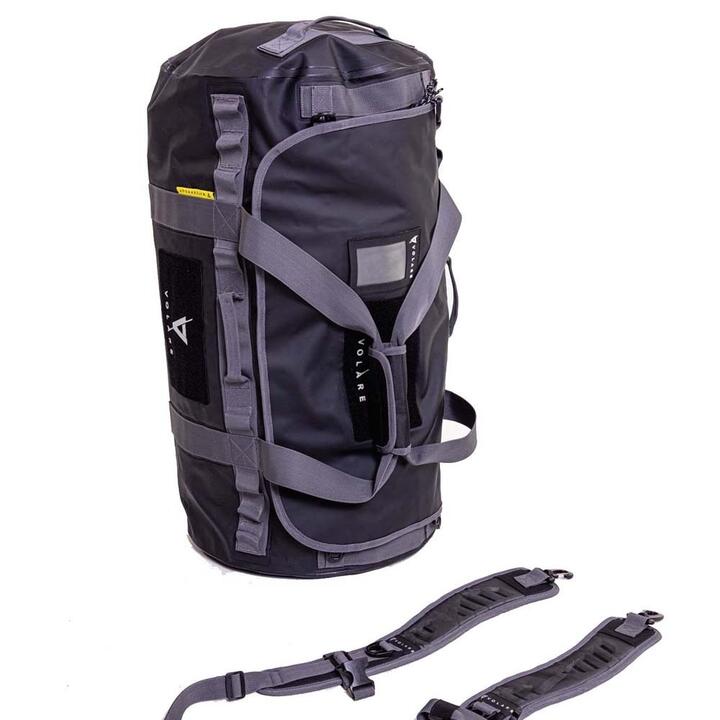 This weatherproof team duffel bag is the ideal sports training bag. Designed for adventure, it’s also the perfect travel duffel. Three unique hook-and-loop patches make this weatherproof team duffel customisable with stock badges for crossfit, rowing, swimming, triathlon or boating. For sports teams the Volare design team can create badges to meet your branding requirements and team needs. Athletes can personalise the individual look of the team duffel for easy identification when travelling or training, with club, team, state or country flag badges allowing for a unique individual look. High frequency welded seams and durable PVC fabric with an additional double layer base makes this duffel hardwearing and totally weatherproof from rain, snow and ocean spray. Volare weatherproof duffels are so water tight they will float if placed on water, however unlike our submersible dry bags, weatherproof duffels use a traditional zipper system with an addition rain flap to stop water ingress, making them weatherproof. Additional features include, daisy chain loops on duffel bag sides, ideal to use as secure lashing points or to attach smaller items or drink bottles with carabineers. Padded removable backpack straps with sternum strap and a built-in emergency whistle, allow for hands free travel as a backpack giving you the best of both worlds. For travelling the main zips are lockable, a weatherproof side pocket with zipper is the perfect place for storing small items that need to be accessible and internally there is a generous clear zip pocket.