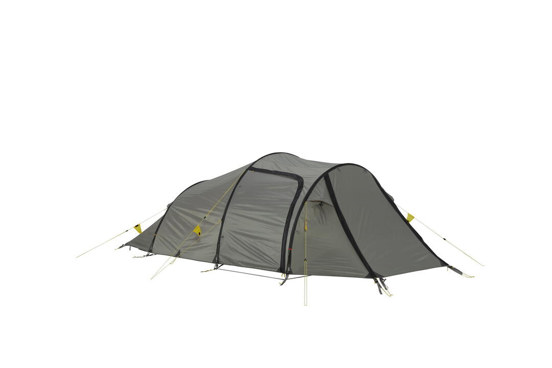 Unique in its kind: One of our most successful models and part of our collection from the beginning. Very spacious tent. The unique inner tent design offers comfortable sleeping space for tall people too. It offers the advantages of an asymmetrical tunnel, such as a relatively small weight and great wind resistance with a large vestibule and spacious inner tent. The entrance to the inner tent is protected from the rain with a D-shaped door and a large vestibule with two entrances. The tent has outside pole sleeves that are easy to use. The inner tent has plenty of space for two people and has back ventilation and numerous pockets. The side and front entrances make it easy to store your gear. When the front entrance is rolled up, an excellent panorama view is possible from the tent.